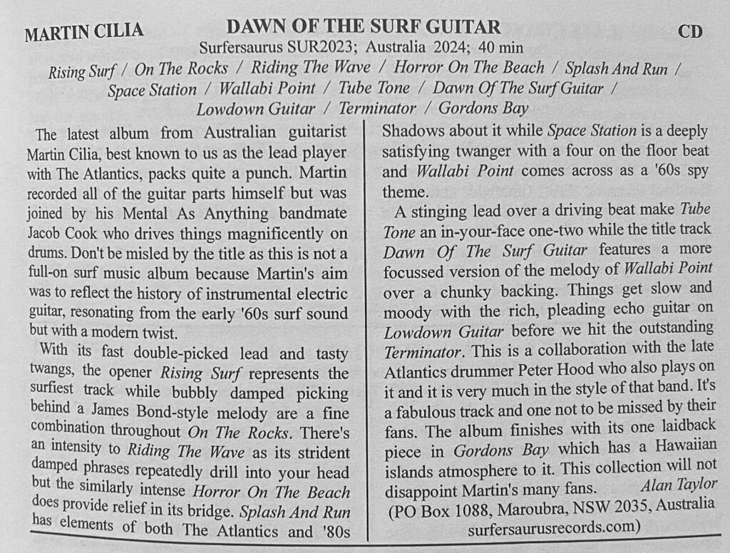 The latest album from Australian guitarist Martin Cilia, best known to us as the lead player with The Atlantics, packs quite a punch. Martin recorded all of the guitar parts himself but was joined by his Mental As Anything bandmate Jacob Cook who drives things magnificently on drums. Don’t be misled by the title as this is not a full-on surf music album because Martin’s aim was to reflect the history of instrumental electric guitar, resonating from the early ’60s surf sound but with a modern twist.